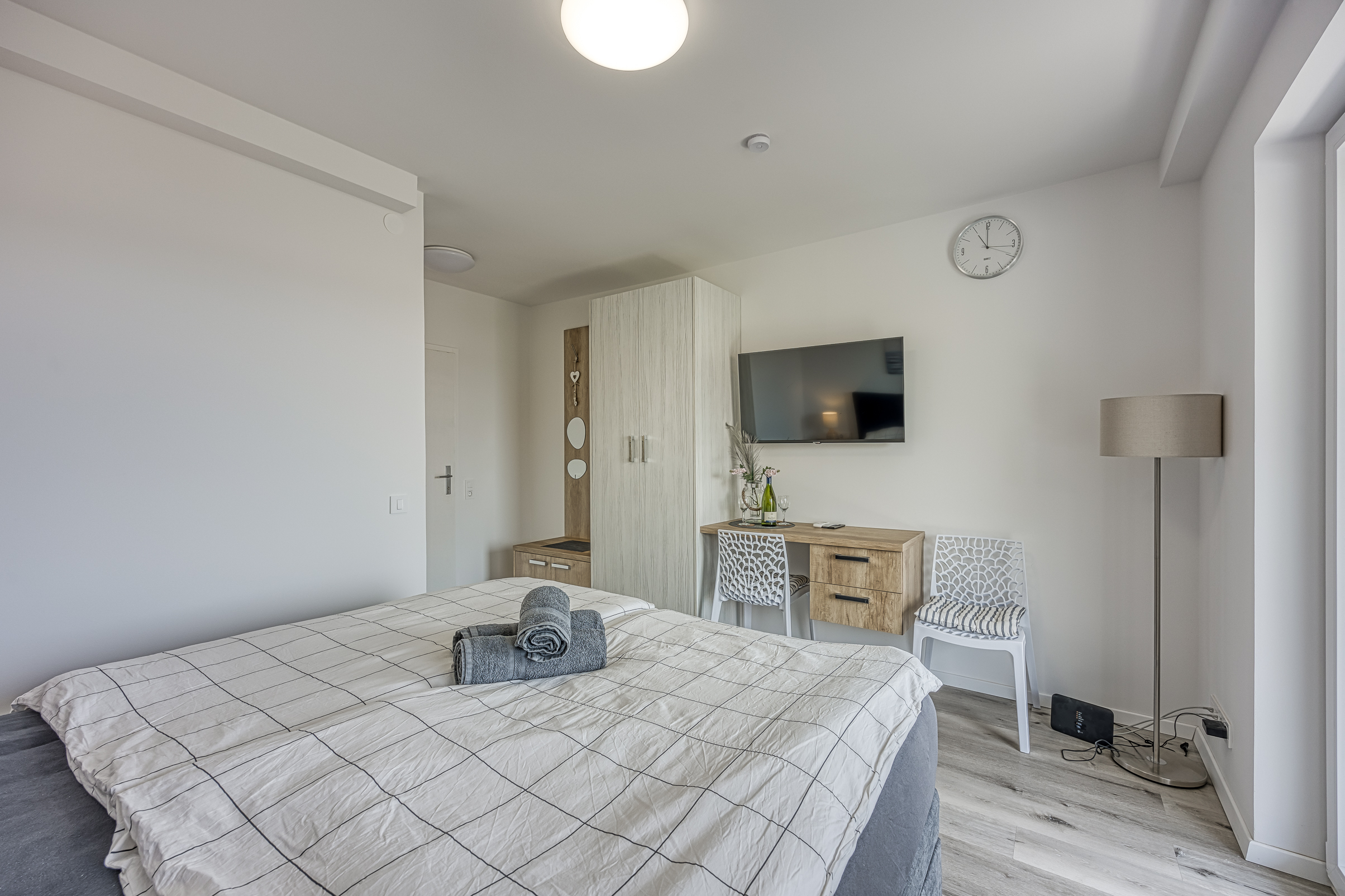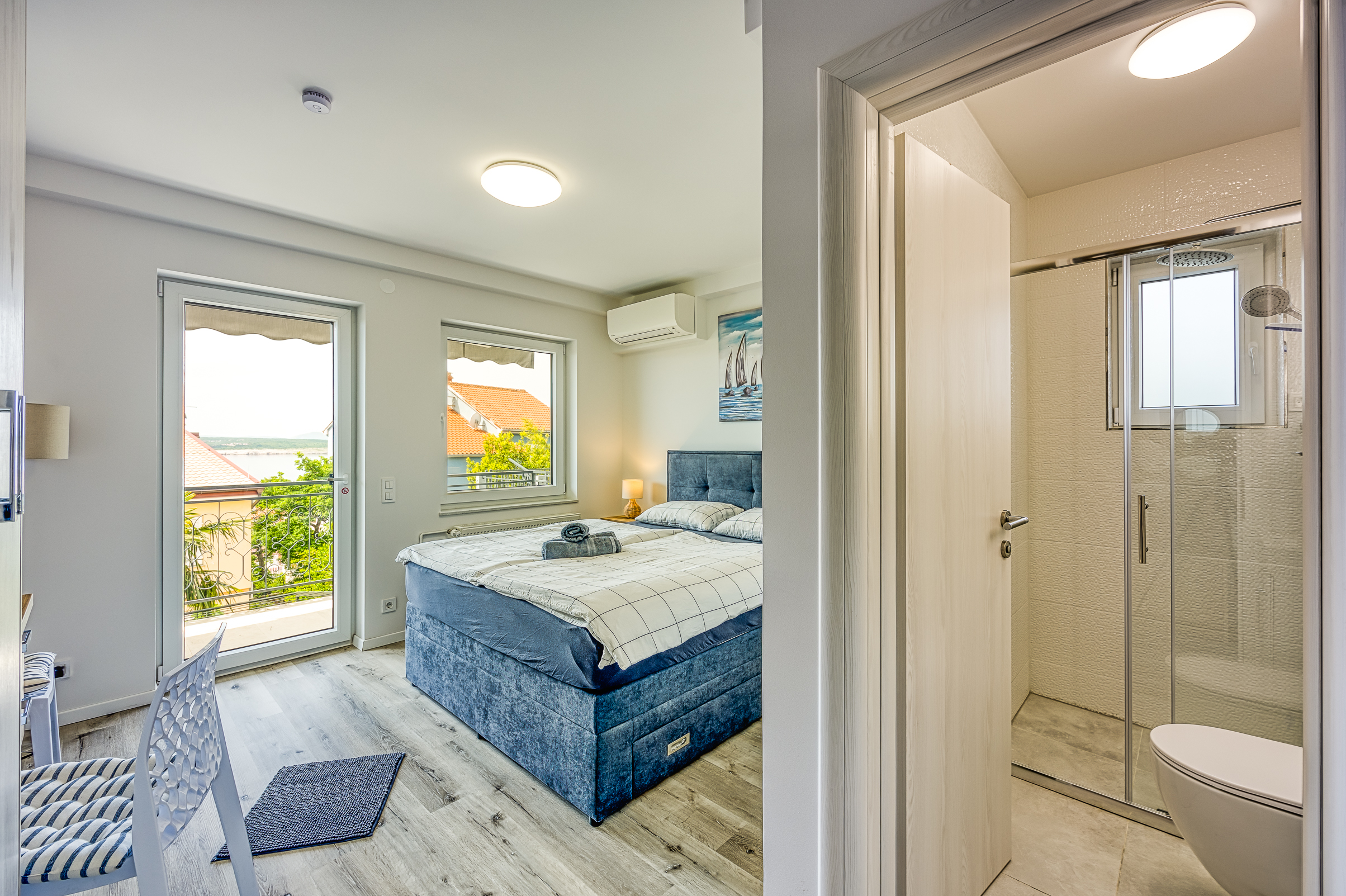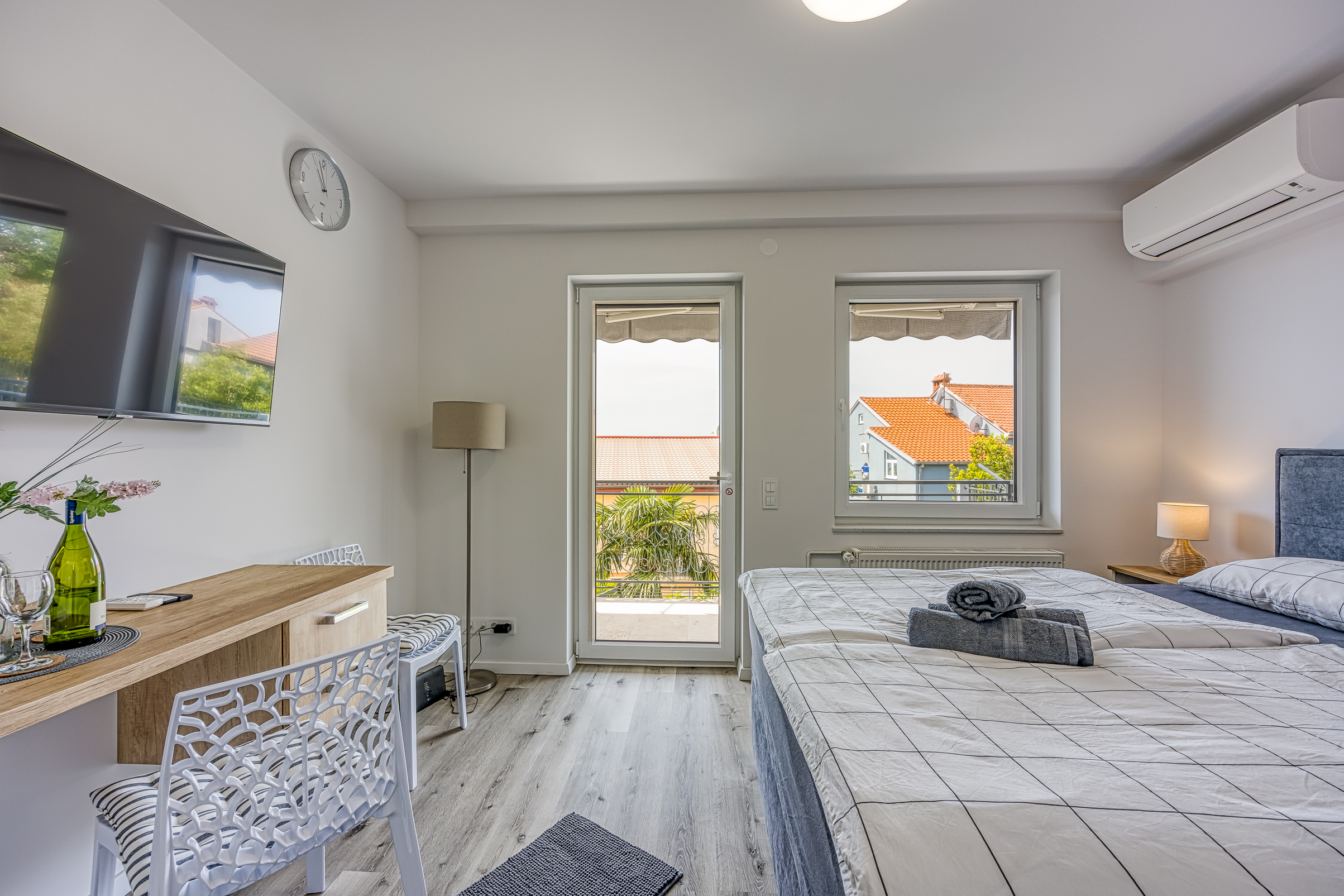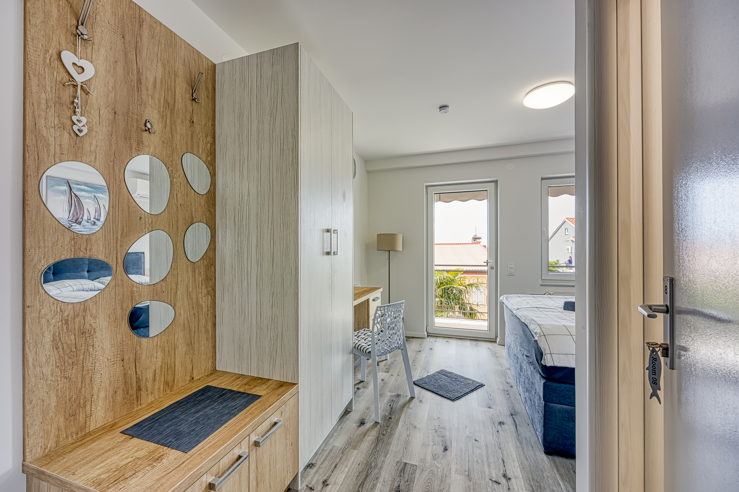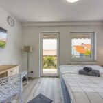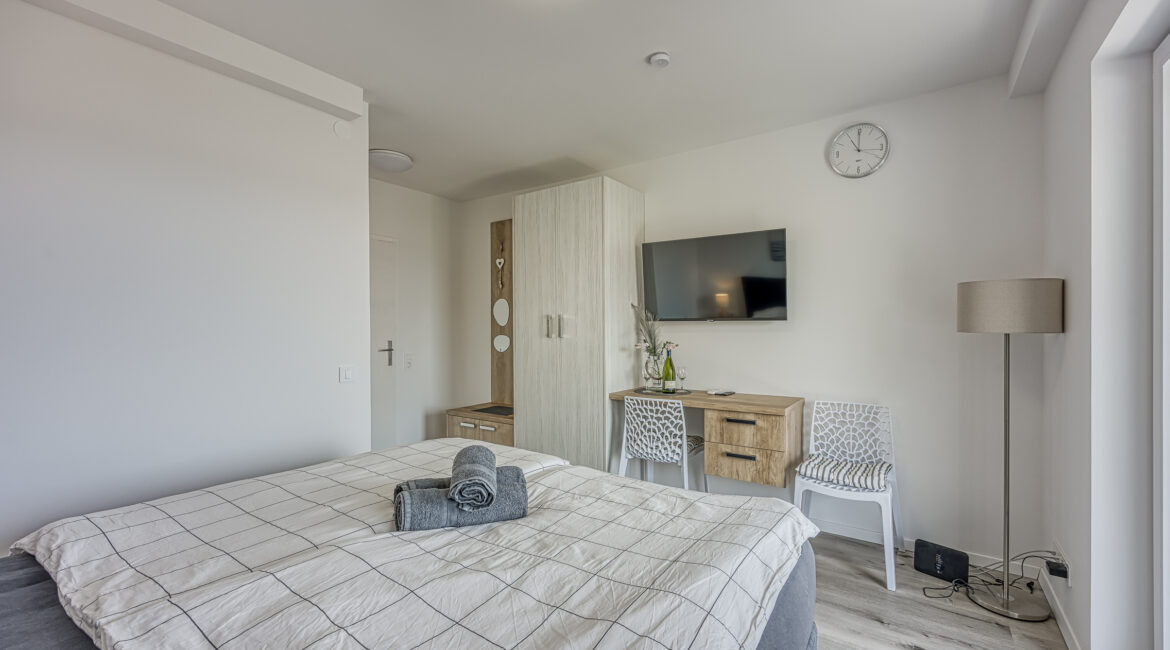 Appartment 8 Details Erwachsene: 2 Ausstattungen: Kaffeemaschine, Klimaanlage, Telefon, Fernseher, Wi-Fi, Gemeinsame Waschmaschine und Trockner, Gemeinsames großes Esszimmer mit allen Küchenutensilien Aussicht: Meer Bettentyp: Großes Doppelbett Verfügbarkeit